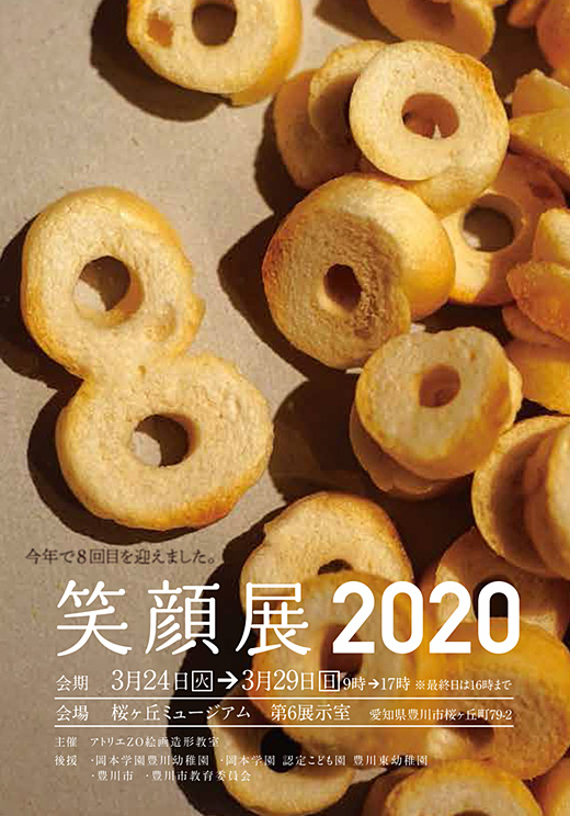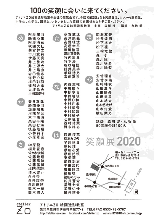 アトリエZO絵画造形教室の生徒の展覧会です。今回で8回目となる笑顔展は、大人から高校生、中学生、小学生、園児と、いきいきとした笑顔の自画像をどうぞご覧ください。